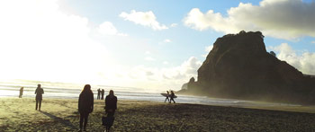 Piha beach attracts courageous surfers as well as those who prefer a picnic or stroll