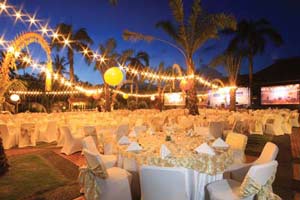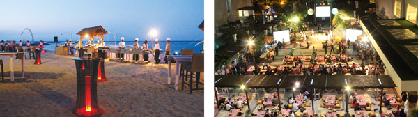 Above: Streetmosphere performers inject fun to a Tupperware convention. Below from left: The Westin Resort Nusa Dua takes dining events onto the beach; Bali Nusa Dua Convention Centre executes a traditional dinner